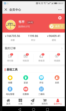 假设将A会员设置成B供应商的招商员,招商员分红比例为3%,B供应商今日在商城销售完成总额为10W元,