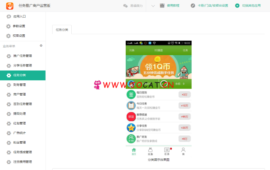 6,推广型任务管理:生成自己的推广链接,建立自己的下线群体,从下线群体中收取抽成佣金(他们完成任务时奖励的奖励分配)。