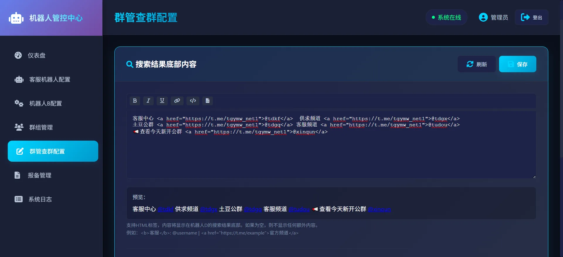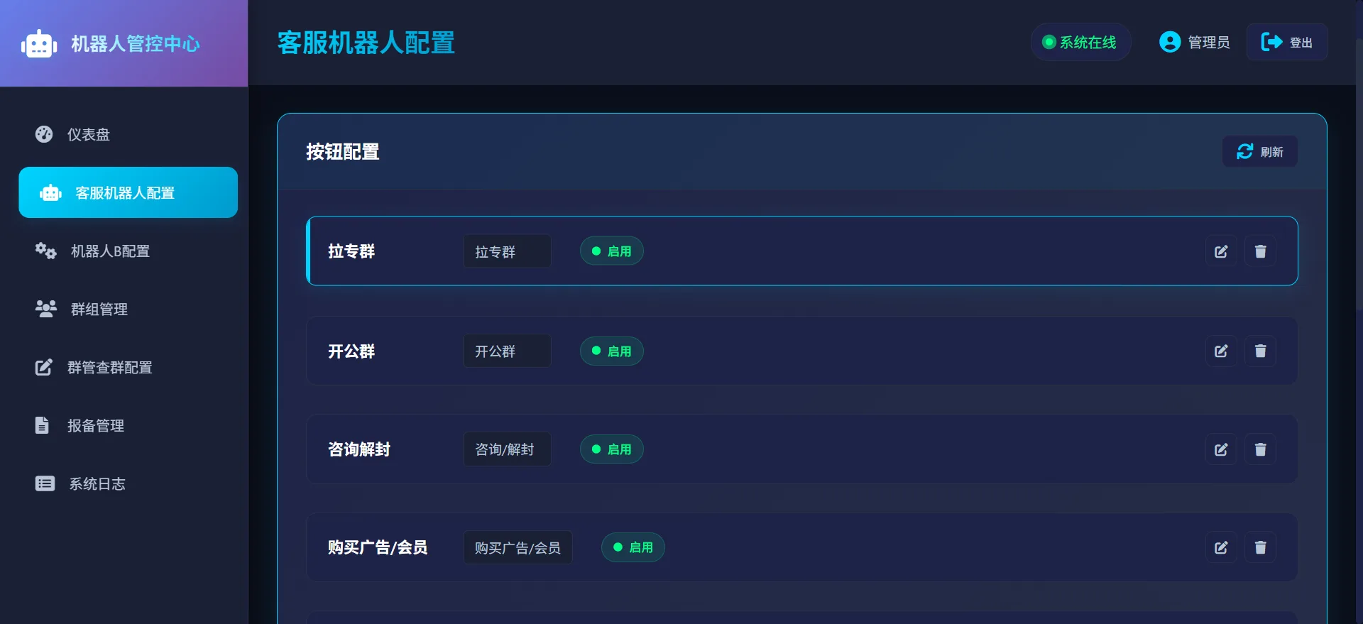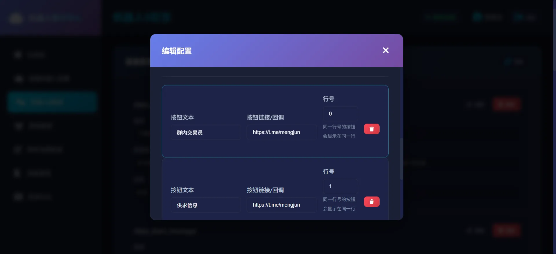 3.机器人b也就是小助手,新增权限认证功能,非授权群组拉入机器人秒退群,新增后台自定义消息按钮布局功能