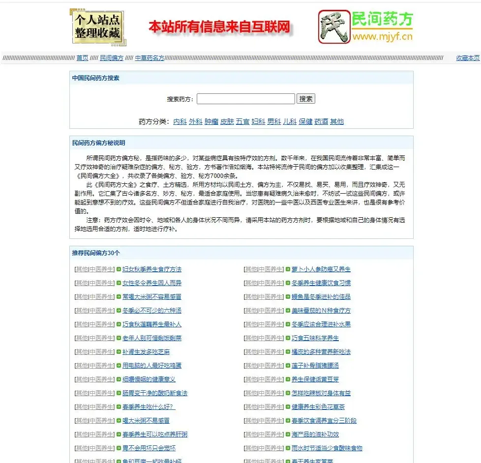 民间药方偏方网整站源码带数据,php版,不需要数据库,数据文件在dat数据格式的文件里,内容包含偏方和药方两部分,有搜索功能!可以结合其他的程序做成比较大的网站!