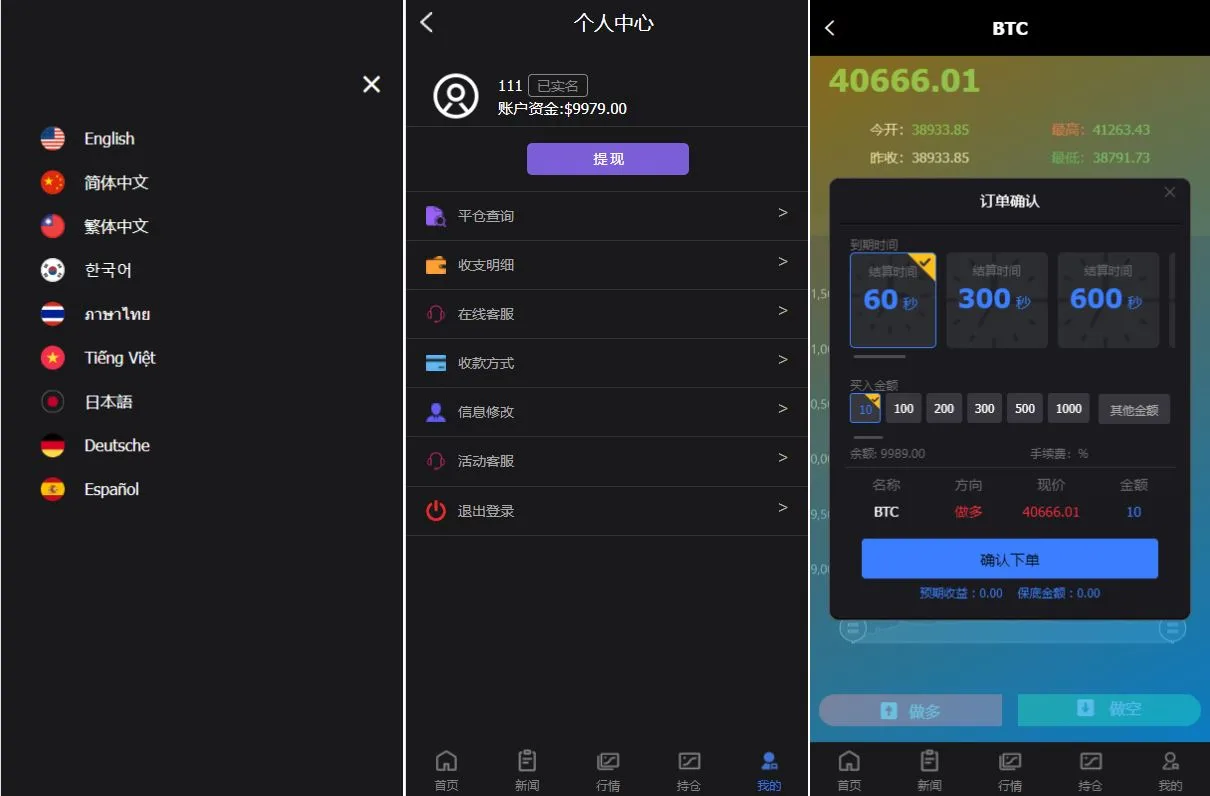 新版UI多语言微交易系统,带黄金外汇虚拟币产品交易 支持投资理财,自带内置客服系统,后台纯越南语