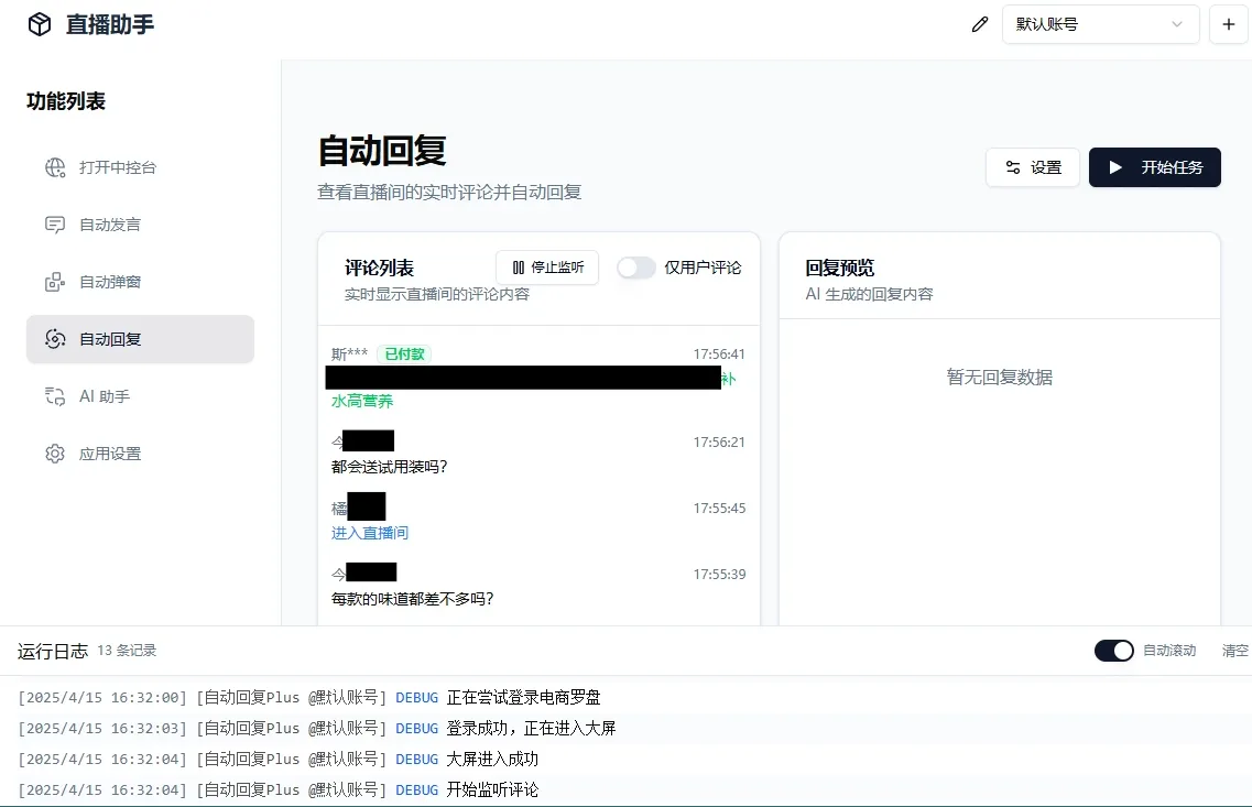 💃 AI 自动回复:实时监听直播互动评论(包括进入直播间、点赞、关注、加入品牌会员、加入粉丝团、下单信息等)、自动生成回复内容(仅限抖音小店/巨量百应)